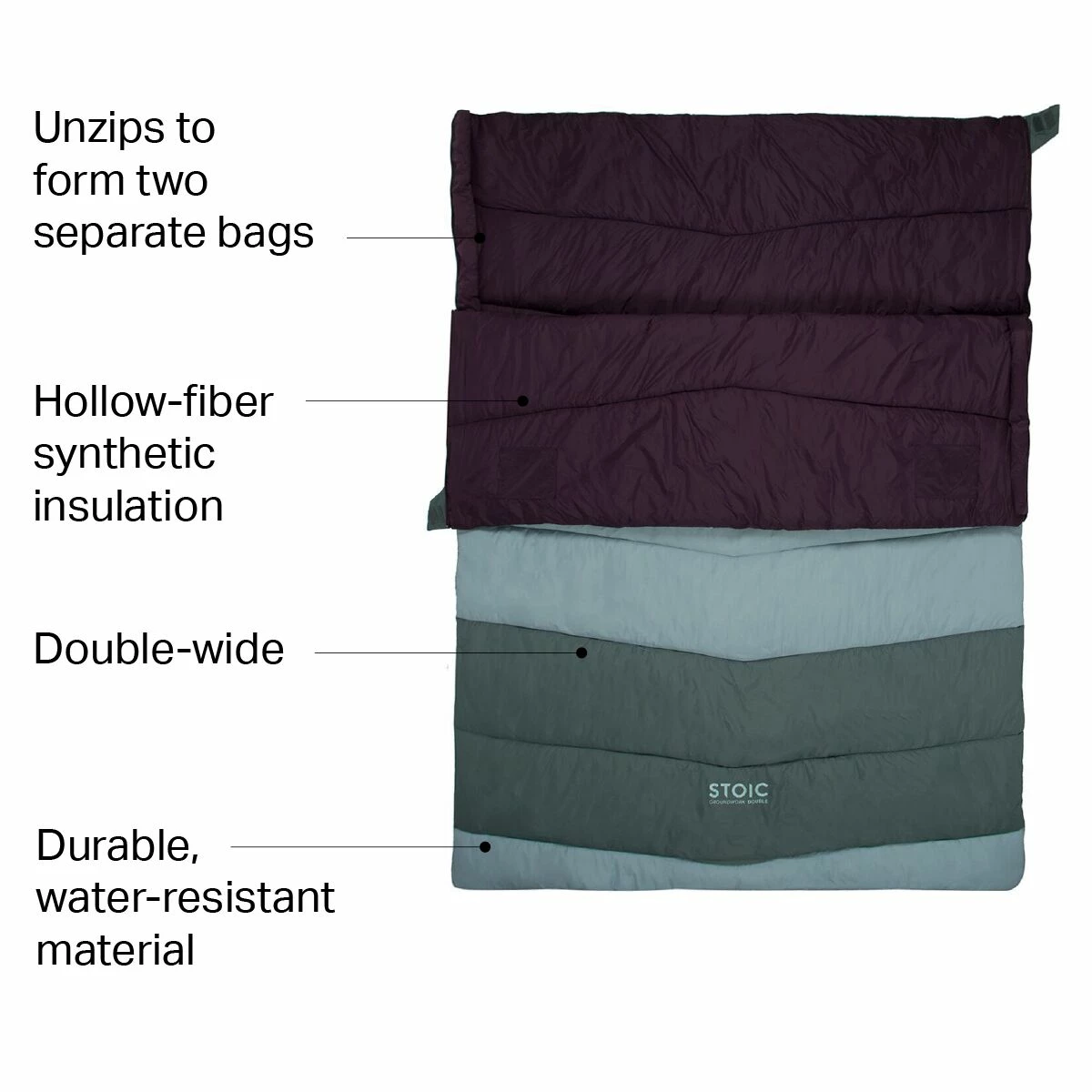 I love the Stoic Synthetic Sleeping Bag! It’s perfect for cold nights, and the double size is roomy enough for two people. The sage and merlot design is also very attractive.